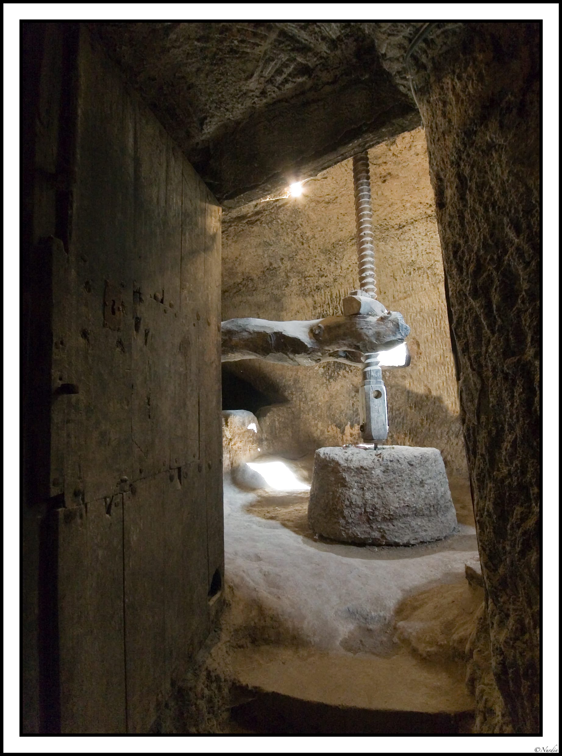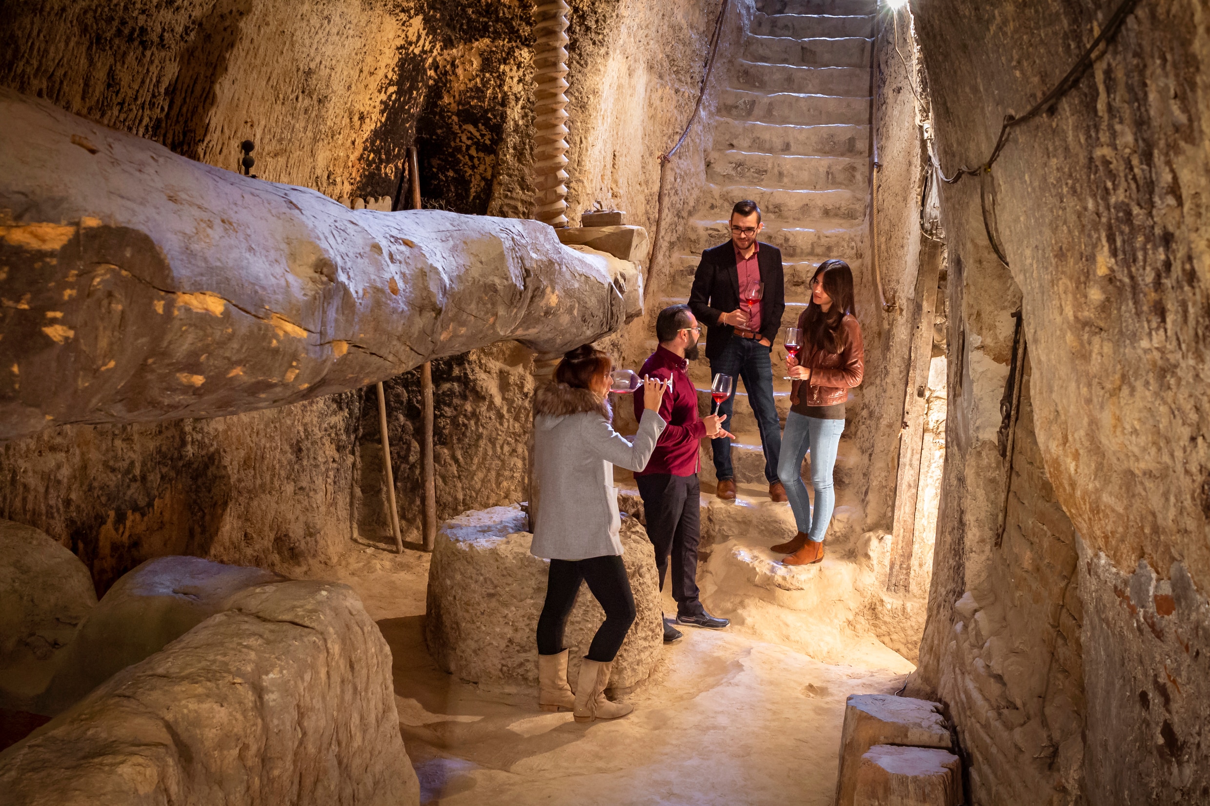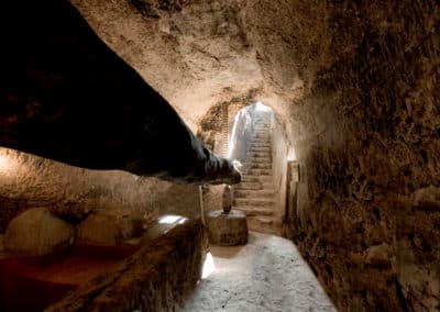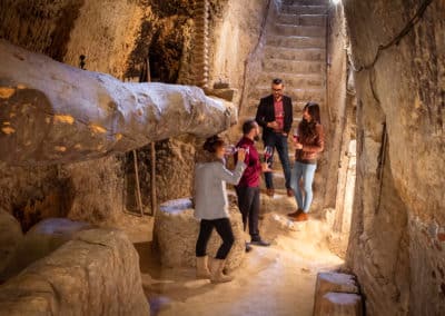 Excavada en tierra a 9 metros de profundidad recorreremos sus laberinticas sisas, el lagar con su espectacular viga romana de 15 metros y más de una tonelada y las salas donde envejecen los mostos hasta convertirse en los excepcionales vinos de Cigales.