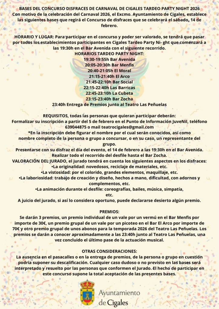 Con motivo de la celebración del Carnaval 2026, el Excmo. Ayuntamiento de Cigales, establece las siguientes bases que regirá el Concurso de disfraces que se celebrará el sábado, 14 de Febrero.