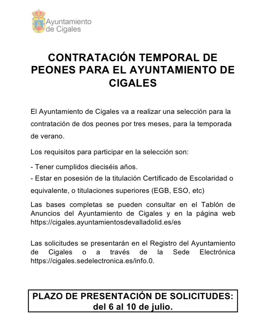 El Ayuntamiento de Cigales informa sobre la Contratación temporal de Peones