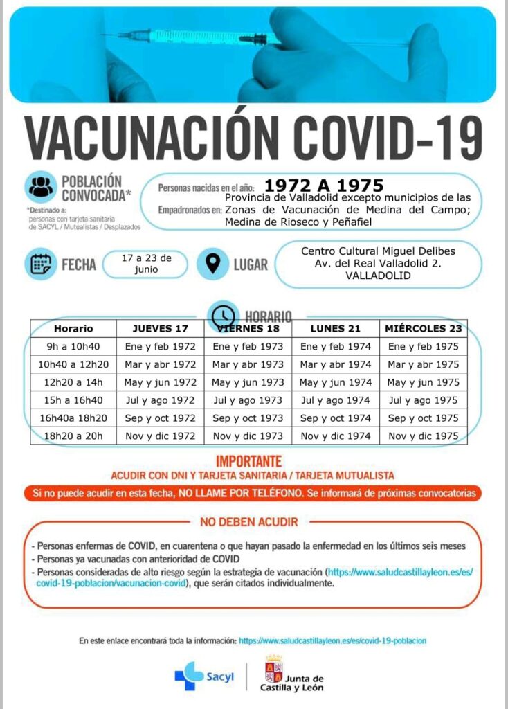 Campaña de vacunación #covid19 en el Centro Cultural Miguel Delibes (Valladolid) para los nacidos los años 1972 a 1975 los días 17 al 23 de junio.