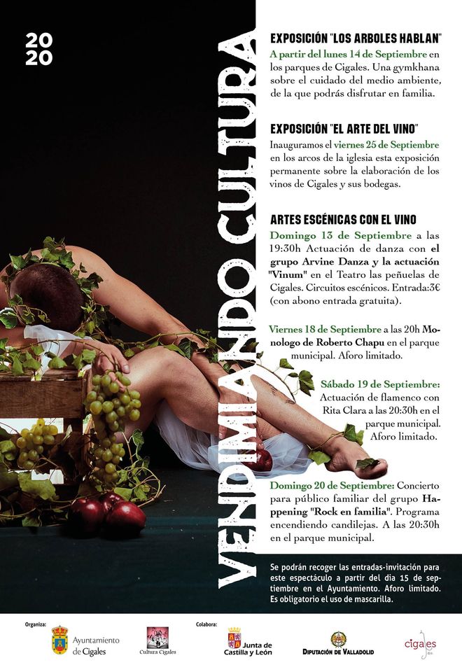 Programación alternativa de la Concejalia de Cultura del Ayuntamiento de Cigales ante la imposibilidad este año de la celebración de la Fiesta de la Vendimia de Cigales por la covid19, una amplia programación donde la música, el humor, la danza y el teatro se unen a través del mismo hilo conductor, El Vino.